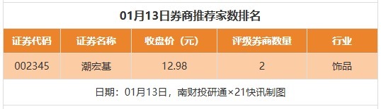 从券商推选派别来看,1月13日有18家上市公司得到券商推选,其中潮宏基赢得2家推选,渝农商行、新集动力等赢得1家推选。