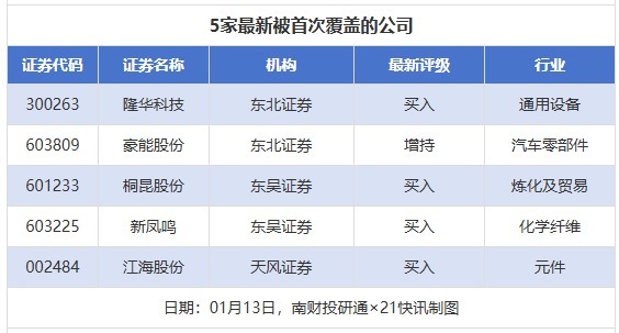 初度遮蔽方面,1月13日券商共给出了5次初度遮蔽,其中隆华科技、豪能股份赢得东北证券诀别赐与“买入”“增握”评级,桐昆股份、新凤鸣均赢得东吴证券赐与“买入”评级,江海股份赢得天风证券赐与“买入”评级。